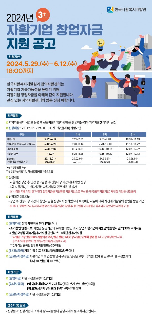 올해 6차례로 나눠 모집·지원하는 ‘2024년 자활기업 창업자금’3차 신청 기간은 오는 12일까지로 자활정보시스템을 통해 신청하면 된다.