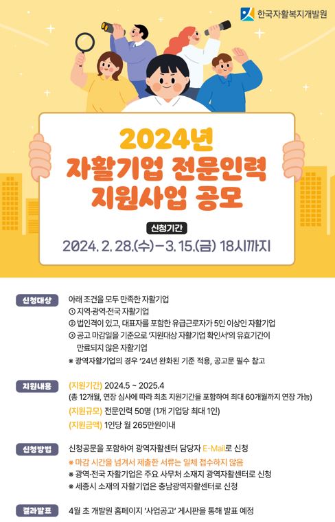 충북광역자활센터(센터장 : 안성희)에서는 자활기업의 지속 성장 및 경쟁력 강화를 위하여 2월 28일부터 3월 14일까지 2주간“2024년 전문 인력 지원사업”참여기업을 모집한다.