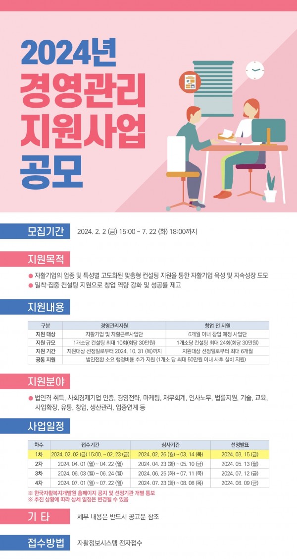 충북광역자활센터에서는 경영관리지원사업 지원 후 다양한 공공재정 지원사업 연계 등 사후관리 지원으로 도내 자활사업의 성장발전을 지원 할 예정이며, 관련사항은 충북광역자활센터 공식홈페이지를 통해 확인할 수 있다. 신청대상에 한하여 2월 23일까지 자활정보시스템으로 신청할 수 있다.