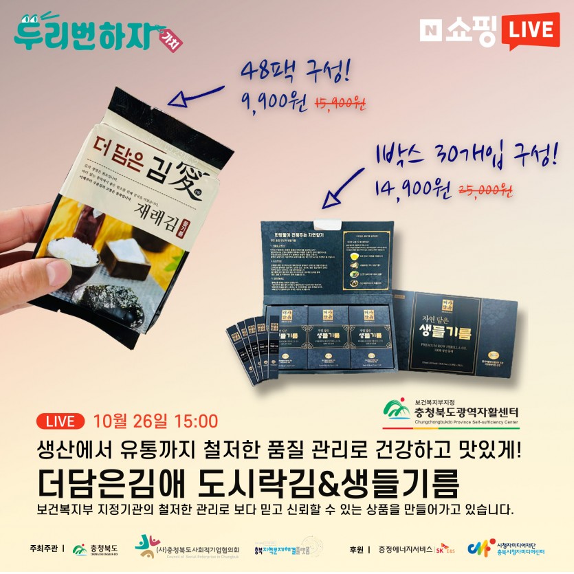 충북자활생산품(도시락김, 생들기름) 쇼핑라이브 진행합니다