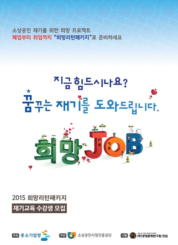2015 희망리턴패키지 재기교육 수강생 모집 안내 페이지 정보 작성자 충북광역자활센터 조회 7,845회 작성일 15-08-24 16:37 목록 첨부파일 2015 희망리턴패키지 재기교육 수강생 모집.pdf (315.8K) 본문 * 1일차는 13시~19시, 2일차는 13시~17시 교육입니다.* 충북 12개 지역자활센터 참여주민 중에 지원대상에 적합한 분이 계시면 안내 바랍니다. 이전글희망키움통장II 4차 추가모집 안내 다음글날개돋다3호 자활퀴즈 정답 및 당첨자 발표