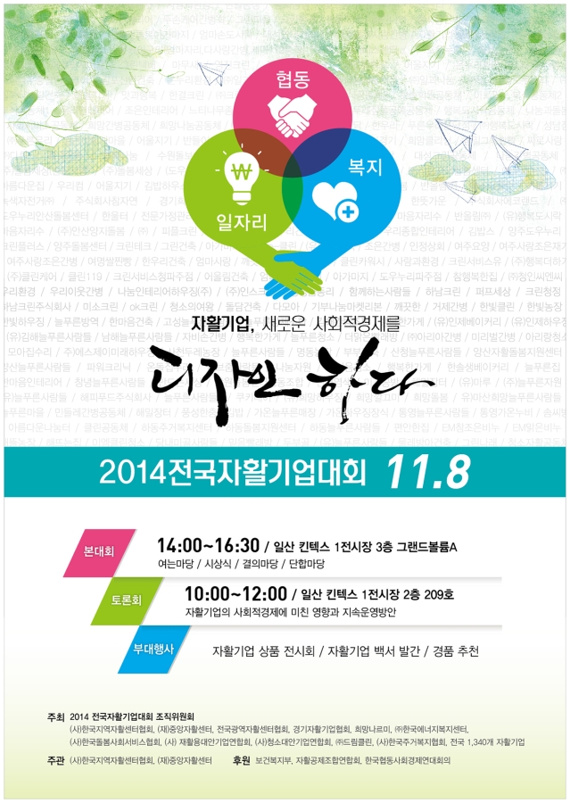 2014 전국자활기업대회 안내 페이지 정보 작성자 충북광역자활센터 조회 7,044회 작성일 14-10-15 15:44 목록 본문 2014 전국자활기업대회 안내 이전글전담자 채용공고) 희망키움통장Ⅱ 전담자 다음글[공고]2014년도 보건복지형 예비사회적기업 모집 공고