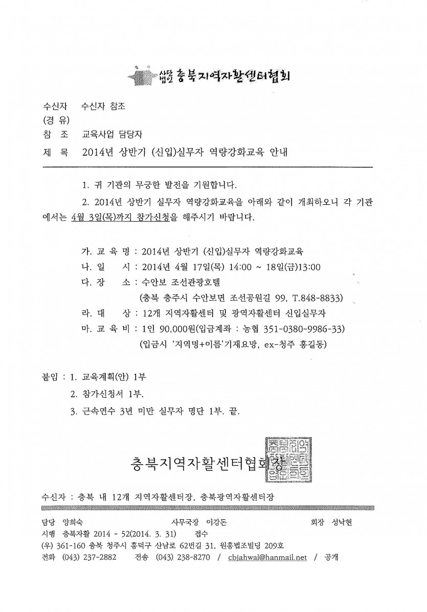 2014년 상반기 (신입)실무자 역량강화교육 안내 페이지 정보 작성자 충북광역자활센터 조회 6,626회 작성일 14-03-31 15:27 목록 본문 2014년 상반기 (신입)실무자 역량강화교육 안내 이전글2014년 제1차 자활생산품전 회의 개최 안내 다음글청소자활기업 대표자 2차 회의