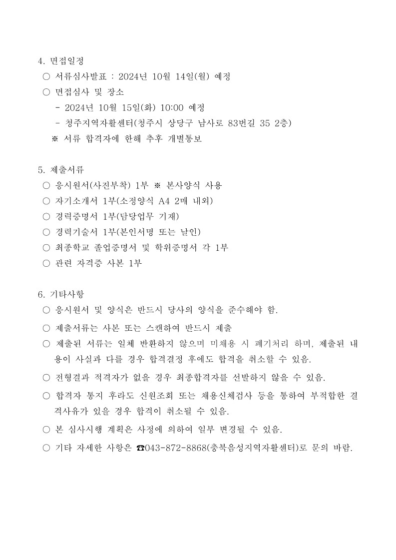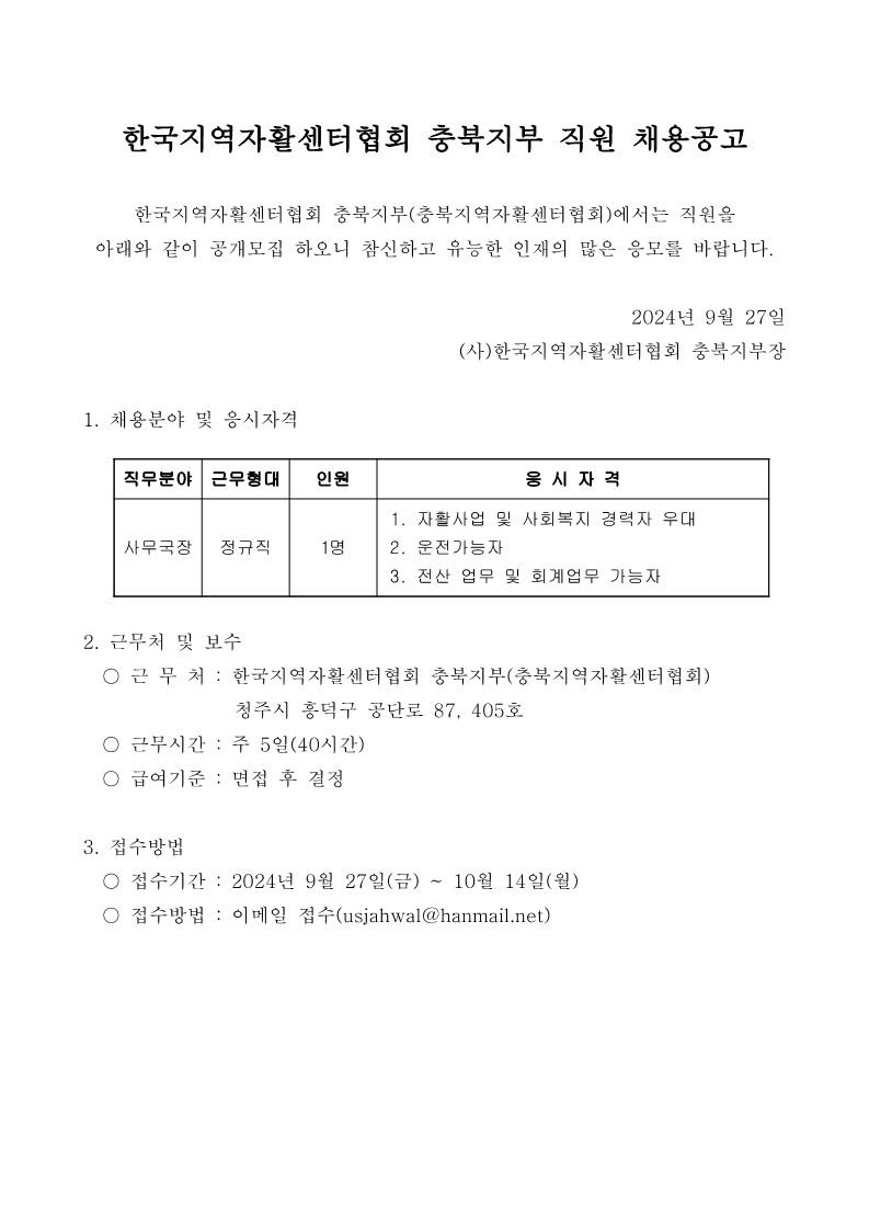 한국지역자활센터협회 충북지부 직원 채용공고 페이지 정보 작성자 충북광역자활센터 조회 1,068회 작성일 24-10-02 14:48 목록 첨부파일 2024년 사무국장 채용공고문.hwp (45.5K) 본문 이전글2024년 대전·충청권 자활생산품 홍보·판매 '좋아유 마켓' 안내 다음글2024년 청년내일저축계좌 특화서비스 '재무컨설팅' 3차 참여자 모집