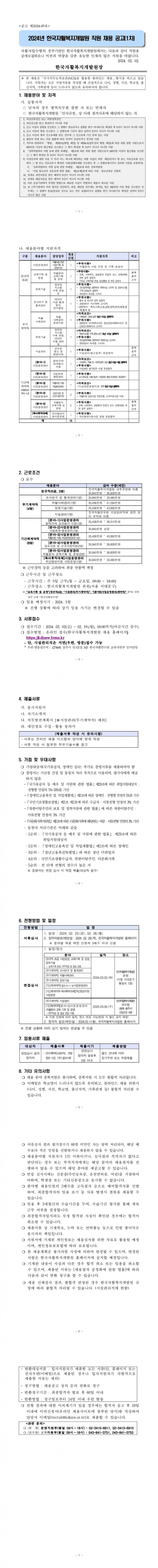 2024년 한국자활복지개발원 직원 채용 공고(1차) 페이지 정보 작성자 충북광역자활센터 조회 3,205회 작성일 24-02-05 17:41 목록 첨부파일 2024년 직원 채용 공고1차 최종.pdf (638.9K) 본문 자세한 사항은 첨부파일 확인 바랍니다. 이전글2024년 제1차 사업장 환경 및 센터시설 개선 지원사업 공모 다음글2024년 경영관리지원사업 공모 1차 신청 안내